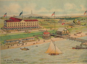 By the 1870s, Duxbury’s rural character and unspoiled bay began to attract summer visitors. Duxbury soon gained a reputation as an idyllic summer resort. With the completion of the Duxbury and Cohasset railroad line, large numbers of city-folk from Boston could pay their $1.50 for a round trip ticket and enjoy Duxbury’s refreshing environment. Boarding houses sprang up everywhere. The Miles Standish Hotel on the Nook soon became enormously popular, and a small settlement of summer cottages appeared nearby along what is now Marshall Street. The Myles Standish monument, completed in 1898, was a result of this tourist influx.