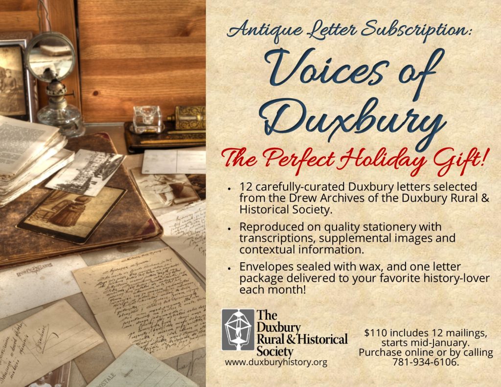 “When I received my monthly DRHS letter subscription as a holiday gift last December, I really wasn’t sure what to expect, but once I opened my first letter I was completely hooked! They are very well designed, and provide colorful historical snippets unique to Duxbury, which makes you pause and realize how truly special our town is! I look forward to receiving them now every month and have already added it to my Christmas list for this year. Well done…I strongly recommend!” -Morgan Mohrman, Duxbury
