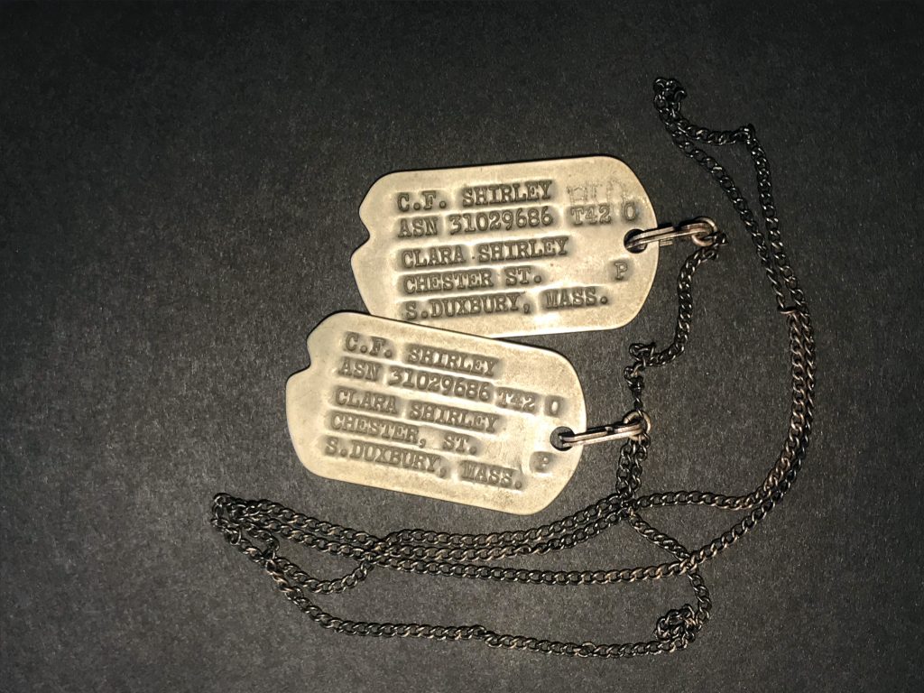 The newest acquisition to the DRHS collection is a pair of World War II dog tags assigned to Charles Fremont (“Monty”) Shirley of Duxbury. Charles was the eldest child of Dr. John Newton and Clara Shirley of Chester Street born April 19, 1917. He attended Partridge Academy in Duxbury, where he was Secretary for his class, played on the basketball team, participated in school plays and was on the Dance Committee. In the 1935-36 yearbook, Charles said his favorite occupation was “Fireflght’ng [sic]” and his ambition… well, he humorously replied “None (It doesn’t pay).”
