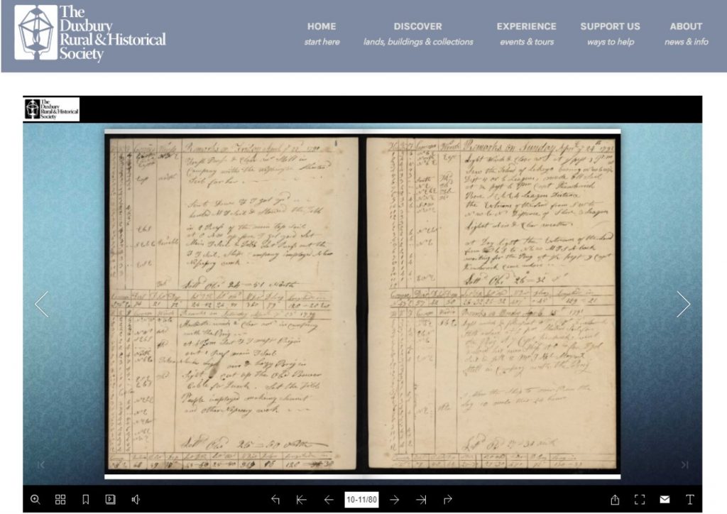 Visit the DRHS Collections Highlight page, “flip through” the logbook now fully digitized and read a partial transcription of the events: https://duxburyhistory.org/collection-highlights/logbook-for-brig-grace-1791/