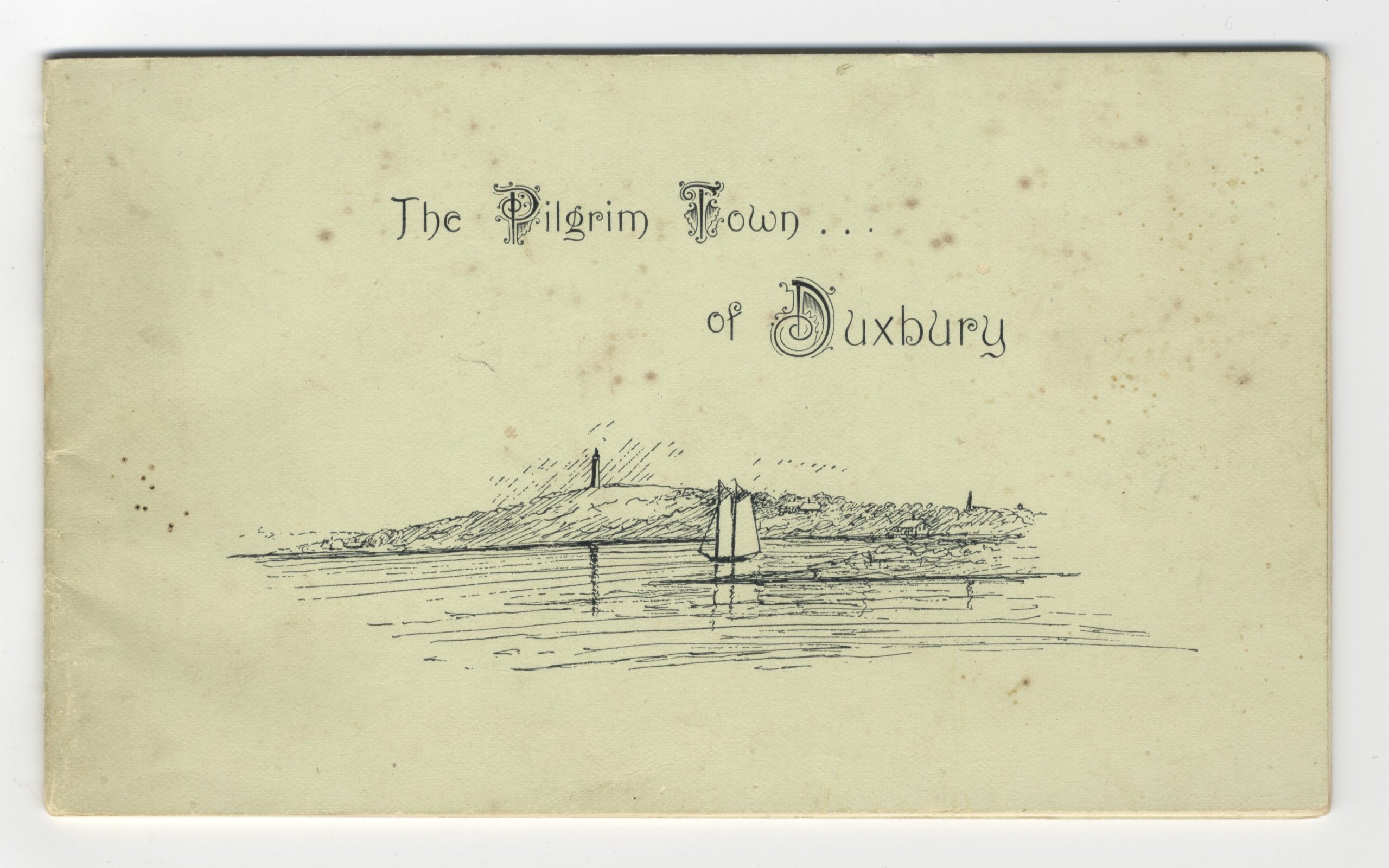 Paper cover booklet with waterfront, sailing boats and monument on hill.Related Object: The Pilgrim Town of Duxbury booklet, 1896