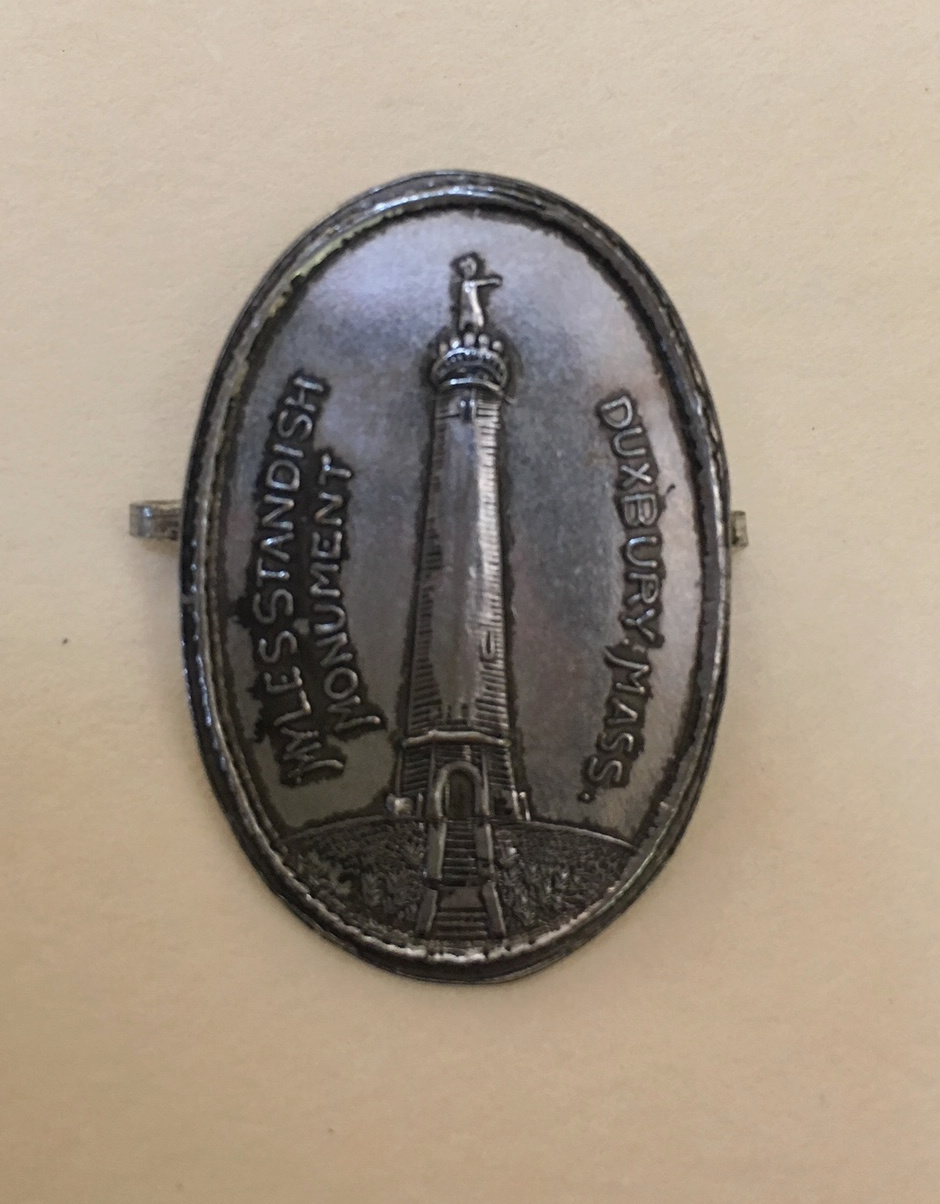 A small collectible medallion featuring the Myles Standish Monument.