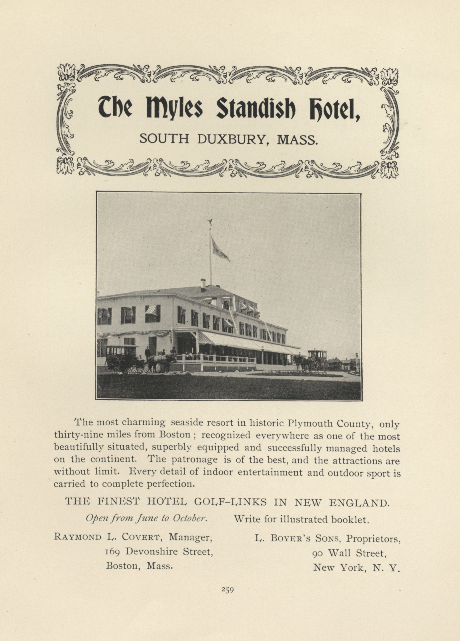 In 1871, a group of Boston entrepreneurs formed the Standish Shore Company and built a hotel known as the Standish House, later known as the Myles Standish Hotel. They also laid out plans for a large development of cottages around the hotel, only a portion of which came to fruition. The hotel, however, was tremendously popular, attracting visitors from Boston, New York and beyond. The hotel featured a golf course, daily concerts, weekly balls, and hosted regattas.