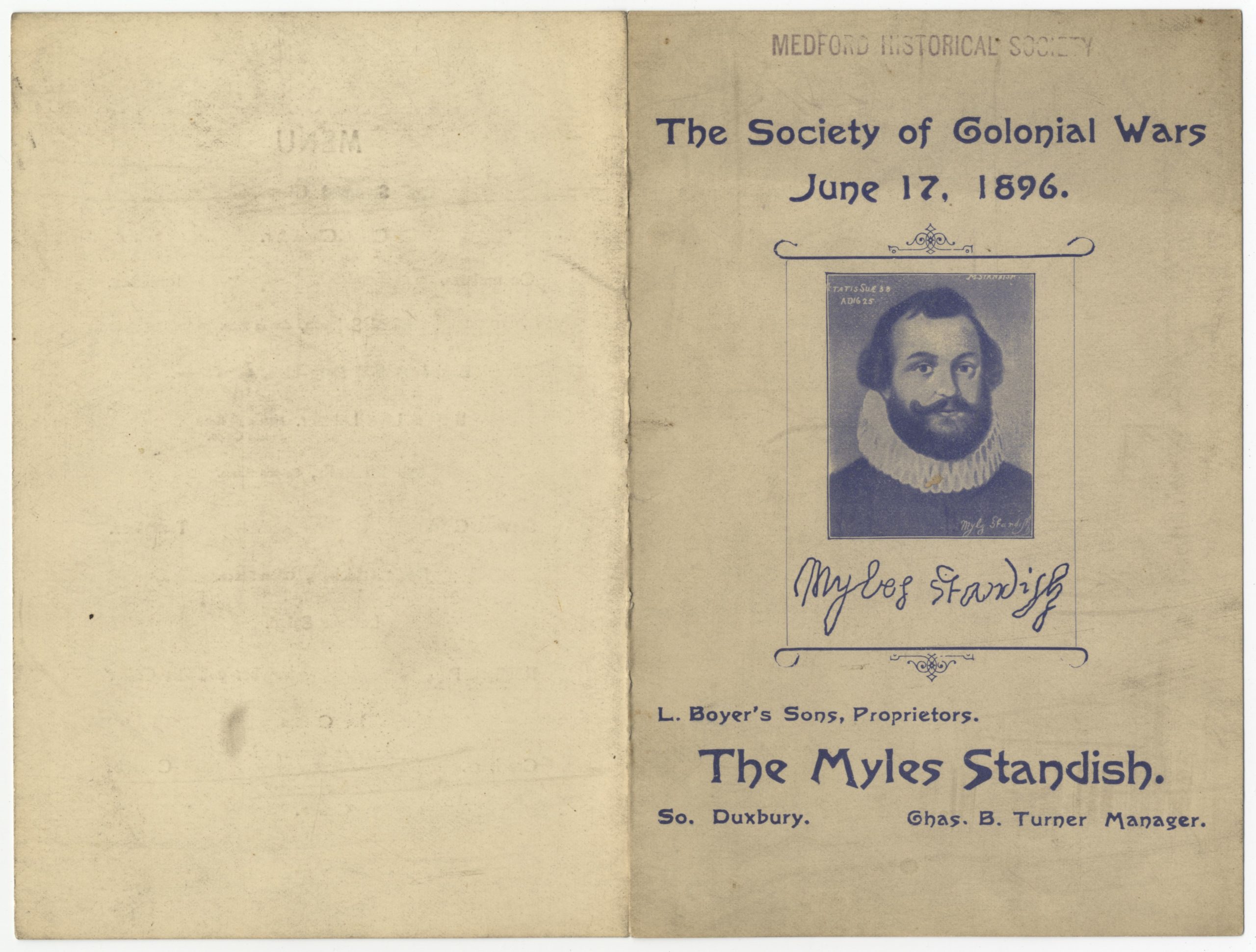 This menu was provided for an event held by The Society of Colonial Wars at the Myles Standish Hotel. The proprietors at the time of this event, L. Boyer & Sons, seeded clams on flats in Duxbury Bay to constantly supply their dining room, seen here in both their steamed and chowder versions.