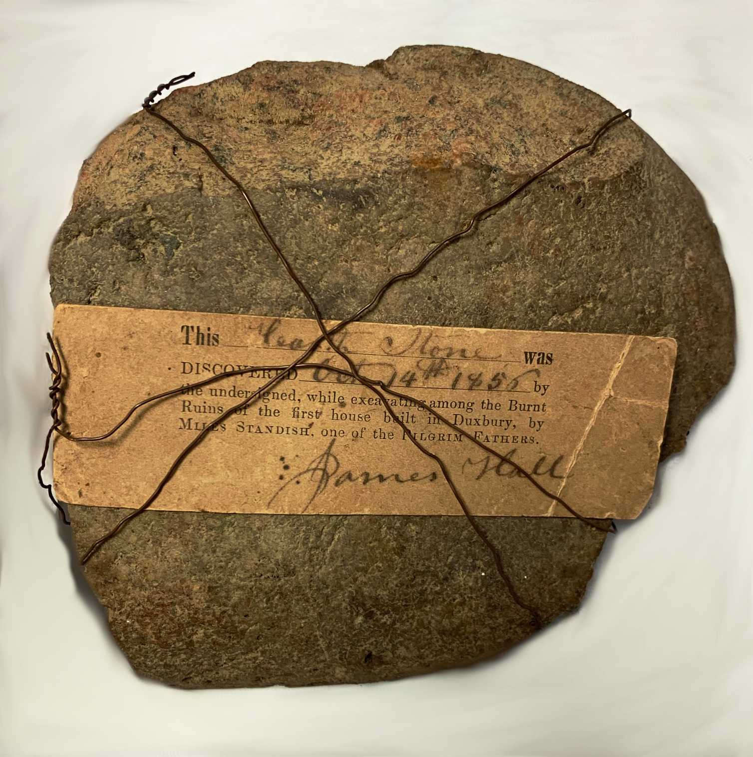 Stone excavated during the James Hall dig of the Myles Standish homesite in 1865. It was likely part of the Standish hearth. Note attached with wire to the stone reads: “This hearth stone was discovered October 14, 1865 by the undersigned, while excavating among the burnt ruins of the first house built in Duxbury, by Myles Standish, one of the Pilgrim fathers.” Signed: James Hall.