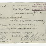 The Bay Farm Dairy was located on land owned by the Loring family since 1702, located on the Duxbury/Kingston town line. Harrison Loring (1822-1907), a prominent shipbuilder in South Boston during the Civil War, was the first to operate a dairy here. His sons, Atherton and Harrison, Jr., incorporated the Bay Farm Company in 1904. In addition to cows, it also raised horses, hogs and chickens. The farm consisted of two main buildings, the dairy, which could accommodate 75 cows, a stable and several outbuildings. The business was sold to White Brothers in the 1930s and continued to operate as a dairy for a time.