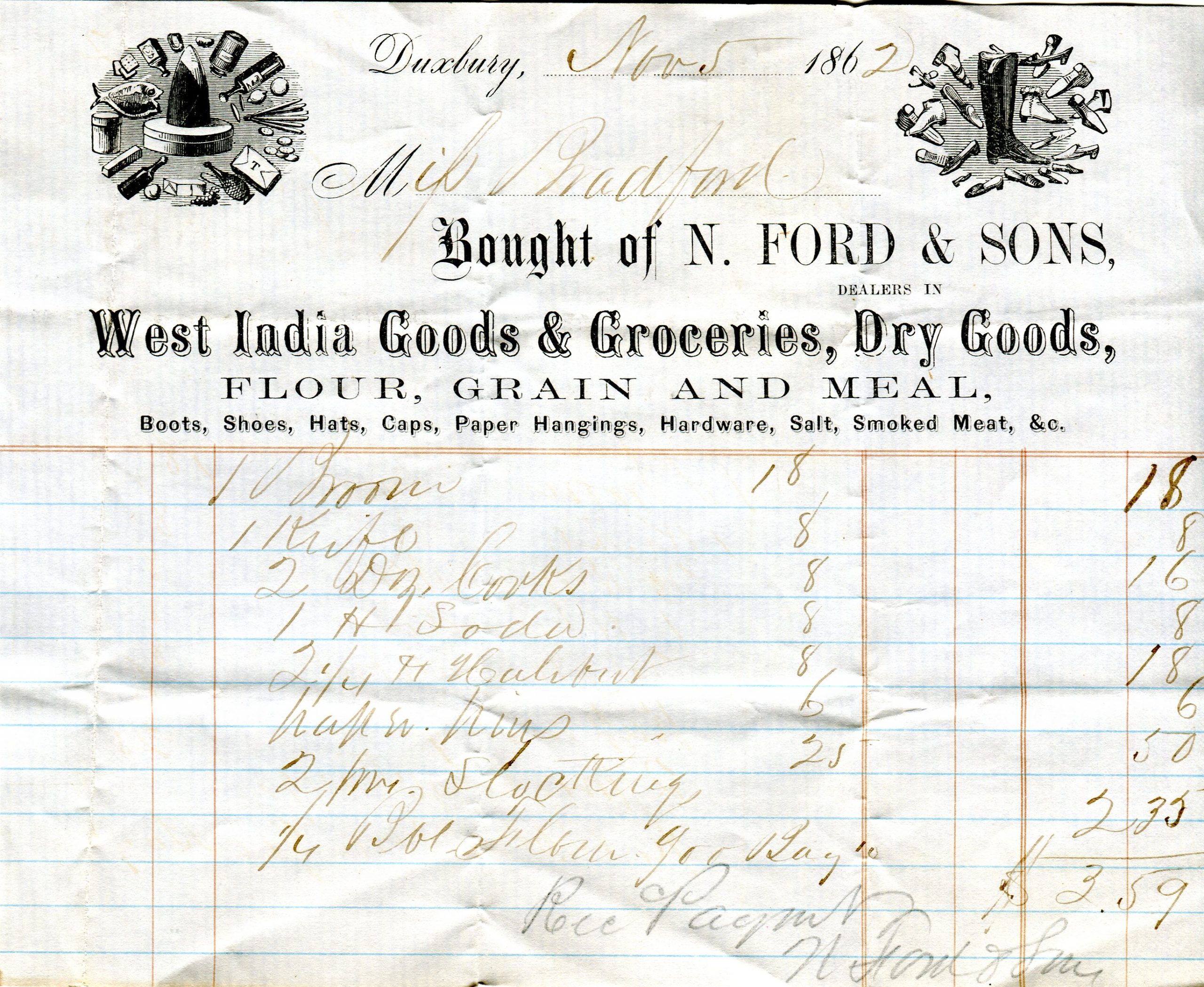 The Ford Store, located on the west side of Tremont Street, just north of Bow Street, claimed to be the oldest department store in America. While that distinction may now be in dispute, there is no doubt that the store established by brothers Nathaniel, James and Peleg Ford in 1826 did indeed carry a wide variety of goods in separate departments on its expansive property. The store flourished throughout the 19th century and became a popular tourist spot in the early 20th century, due both to its “oldest” designation, and the fact that famed Senator Daniel Webster of Marshfield frequently visited. The Fords stocked their store with products from around the globe, brought to Duxbury by packet boat and stagecoach from Boston. The entrepreneurial Fords also owned a mill adjacent to the store in which they manufactured goods for sale.