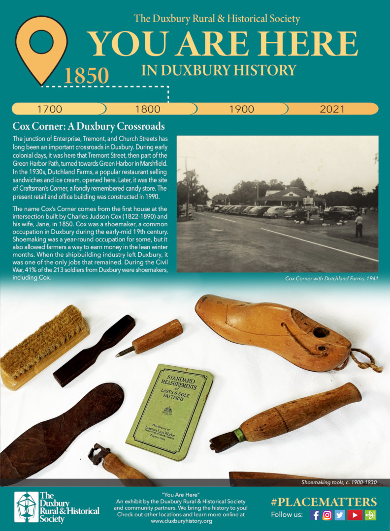 The name Cox’s Corner comes from the first house at the intersection built by Charles Judson Cox (1822-1890) and his wife, Jane, in 1850. Cox was a shoemaker, a common occupation in Duxbury during the early-mid 19th century.